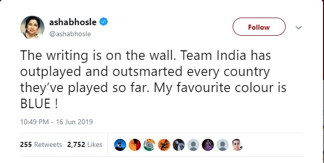 "The writing is on the wall. Team India has outplayed and outsmarted every country they've played so far. My favourite colour is BLUE," singer Asha Bhosle tweeted.