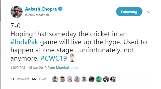 "7-0 Hoping that someday the cricket in an #IndvPak game will live up the hype. Used to happen at one stage....unfortunately, not anymore. #CWC19," former Indian cricketer Aakash Chopra tweeted.