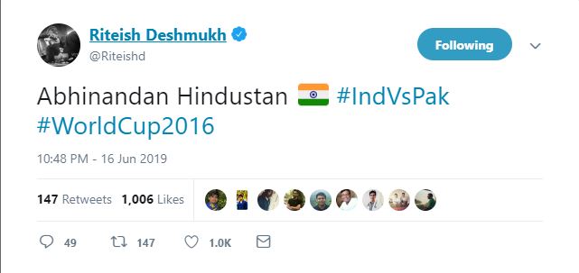 "Abhinandan Hindustan #IndVsPak #WorldCup2016," Bollywood actor Ritesh Deshmukh tweeted.