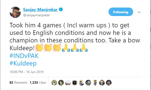 "Took him 4 games ( Incl warm-ups ) to get used to English conditions and now he is a champion in these conditions too. Take a bow Kuldeep #INDvPAK #Kuldeep," former Indian cricketer Sanjay Manjrekar tweeted.