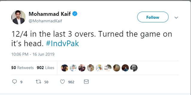 "12/4 in the last 3 overs. Turned the game on its head. #IndvPak," former Indian cricketer Mohammad Kaif tweeted.