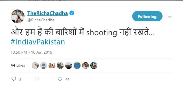 "aur hm haiN kii baarishoN meN shooting nhiiN rkhte... #IndiavPakistan," Bollywood actor Richa Chadha tweeted.