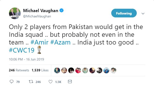 "Only 2 players from Pakistan would get in the India squad .. but probably not even in the team .. #Amir #Azam. India just too good .. #CWC19," former England skipper Michael Vaughan tweeted.
