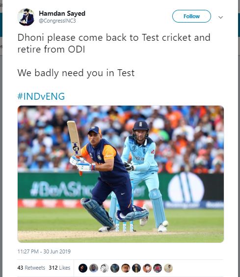 "Dhoni please come back to Test cricket and retire from ODI, We badly need you in Test #INDvENG," another Twitter user wrote.