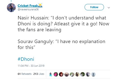 "Nasir Hussain: "I don't understand what Dhoni is doing? At least give it a go! Now the fans are leaving, Sourav Ganguly: "I have no explanation for this" #Dhoni," another fan tweeted.