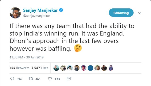 "If there was any team that had the ability to stop India's winning run, it was England. Dhoni's approach in the last few overs, however, was baffling," former Indian cricketer Sanjay Manjrekar tweeted.
