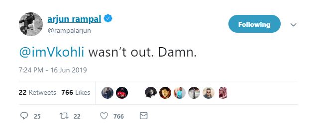 "@imVkohli wasn't out. Damn," Bollywood actor Arjun Rampal tweeted.