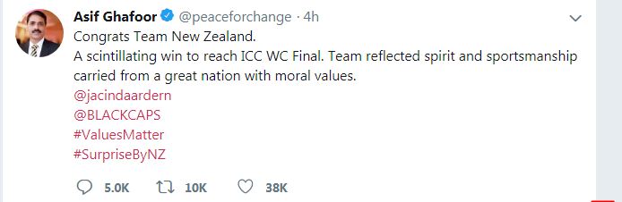 "Congrats Team New Zealand. A scintillating win to reach ICC WC Final. Team reflected spirit and sportsmanship carried from a great nation with moral values. @jacindaardern @BLACKCAPS #ValuesMatter #SurpriseByNZ," Ghafoor tweeted.
