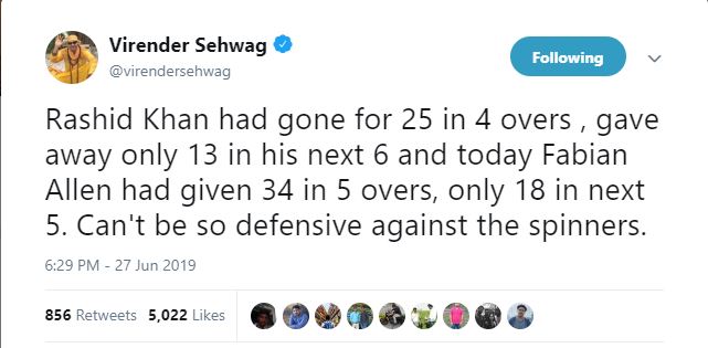 "Rashid Khan had gone for 25 in 4 overs, gave away only 13 in his next 6 and today Fabian Allen had given 34 in 5 overs, only 18 in next 5. Can't be so defensive against the spinners," Sehwag tweeted.