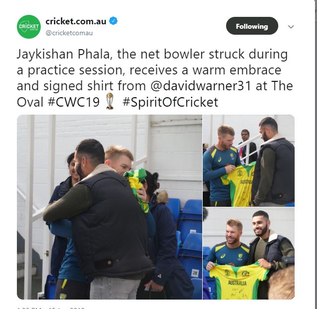 "Jaykishan Phala, the net bowler struck during a practice session, receives a warm embrace and signed shirt from @davidwarner31 at The Oval #CWC19 #SpiritOfCricket," cricket.com.au tweeted.
