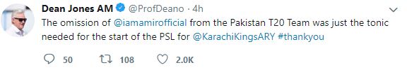 Jones took to Twitter and said: "The omission of @iamamirofficial from the Pakistan T20 Team was just the tonic needed for the start of the PSL for @KarachiKingsARY #thankyou"