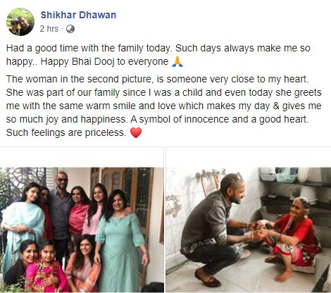 In another post on the platform, Dhawan posted two photos while captioning it as: "Had a good time with the family today. Such days always make me so happy ... Happy Bhai Dooj to everyone."