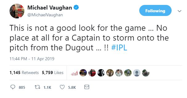 "This is not a good look for the game ... No place at all for a Captain to storm onto the pitch from the Dugout ... !! #IPL," Michael Vaughan, former England captain tweeted.