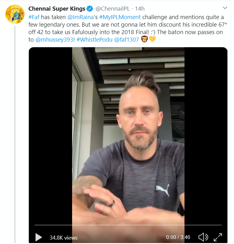 Plessis shared his favourite memory as he was nominated by teammate Suresh Raina to do so under the hashtag #MyIPLmoment.