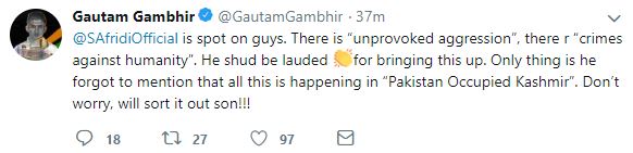 "@SAfridiOfficial is spot on guys. There is "unprovoked aggression", there r "crimes against humanity". He shud be lauded for bringing this up. Only thing is he forgot to mention that all this is happening in "Pakistan Occupied Kashmir". Don't worry, will sort it out son!!!" MP and former India batsman Gambhir tweeted.