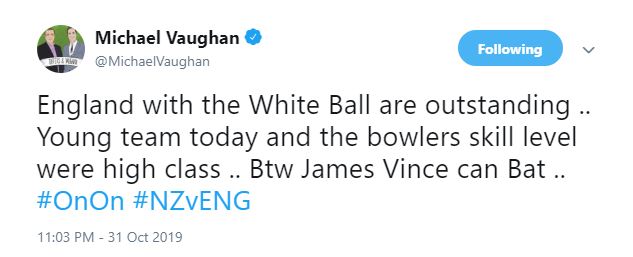 "England with the White Ball are outstanding .. Young team today and the bowlers skill level were high class .. Btw James Vince can Bat .. #OnOn #NZvENG," Vaughan tweeted.