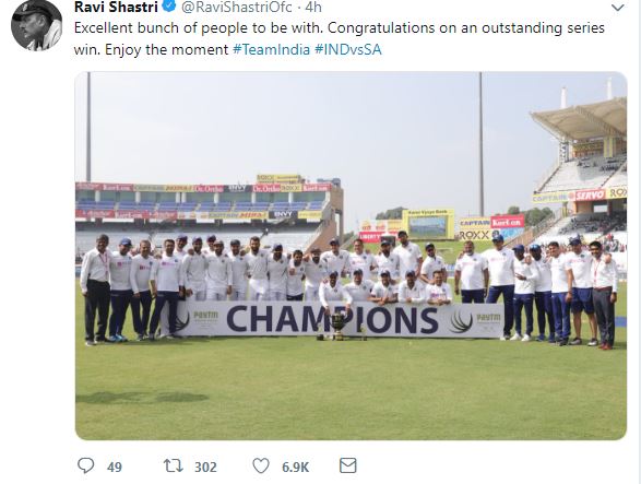 "Excellent bunch of people to be with. Congratulations on an outstanding series win. Enjoy the moment #TeamIndia #INDvsSA," Shastri tweeted.