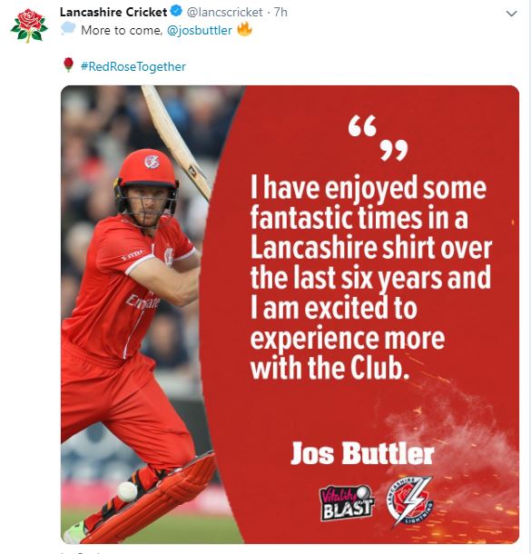 Lancashire Cricket Club on July 26 announced that Buttler has signed a new three-year contract extension. The wicket-keeper batsman will now play for the club until at least 2022.