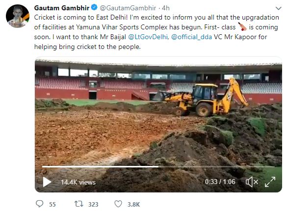 "Cricket is coming to East Delhi! I'm excited to inform you all that the upgradation of facilities at Yamuna Vihar Sports Complex has begun. First-class cricket is coming soon. I want to thank Mr Baijal @LtGovDelhi, @official_dda VC Mr Kapoor for helping bring cricket to the people," Gambhir tweeted.