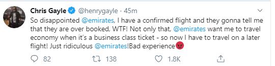 Taking to Twitter, the Windies cricketer wrote: "So disappointed @emirates, I have a confirmed flight and they gonna tell me that they are over booked, WTF! Not only that, @emirates want me to travel economy when it's a business class ticket - so now I have to travel on a later flight! Just ridiculous @emirates!Bad experience."