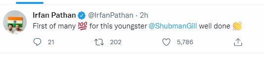 Irfan said in his tweet, "First of many for this youngster @ShubmanGill, well done"