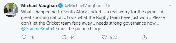 "What's happening to South Africa cricket is a real worry for the game. A great sporting nation. Look what the Rugby team have just won. Please don't let the Cricket team fade away .. needs strong governance now .. @GraemeSmith49 must be put in charge," Vaughan tweeted.