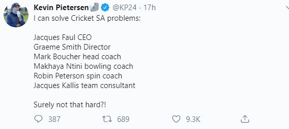 "I can solve Cricket SA problems-- Jacques Faul CEO , Graeme Smith Director, Mark Boucher head coach, Makhaya Ntini bowling coach, Robin Peterson spin coach, Jacques Kallis team consultant, Surely not that hard," Pietersen had tweeted.