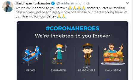 "Yes we are indebted to you forever doctors, nurses all medical help workers, police and every single one who is out there working for all of us .. Praying for your Saftey," Harbhajan tweeted.