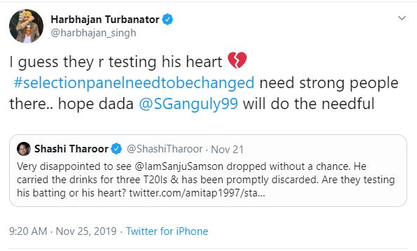 "I guess they r testing his heart #selectionpanelneedtobechanged need strong people there.. hope dada @SGanguly99 will do the needful," Harbhajan tweeted.