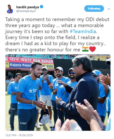 The 26-year-old shared the picture on Twitter and captioned the post as: "Taking a moment to remember my ODI debut three years ago today ... what a memorable journey it's been so far with #TeamIndia. Every time I step onto the field, I realize a dream I had as a kid to play for my country.. there's no greater honour for me".
