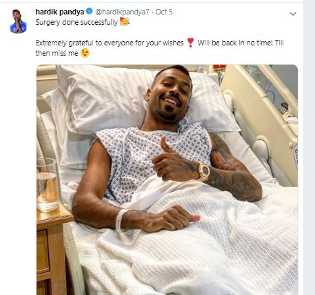 "Surgery done successfully. Extremely grateful to everyone for your wishes. Will be back in no time! Till then miss me," Hardik tweeted.
