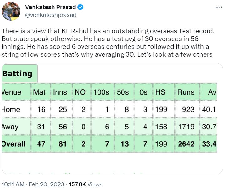 "There is a view that KL Rahul has an outstanding overseas Test record. But stats speak otherwise. He has a test avg of 30 overseas in 56 innings. He has scored 6 overseas centuries but followed it up with a string of low scores that's why averaging 30. Let's look at a few others," tweeted Prasad on Monday.