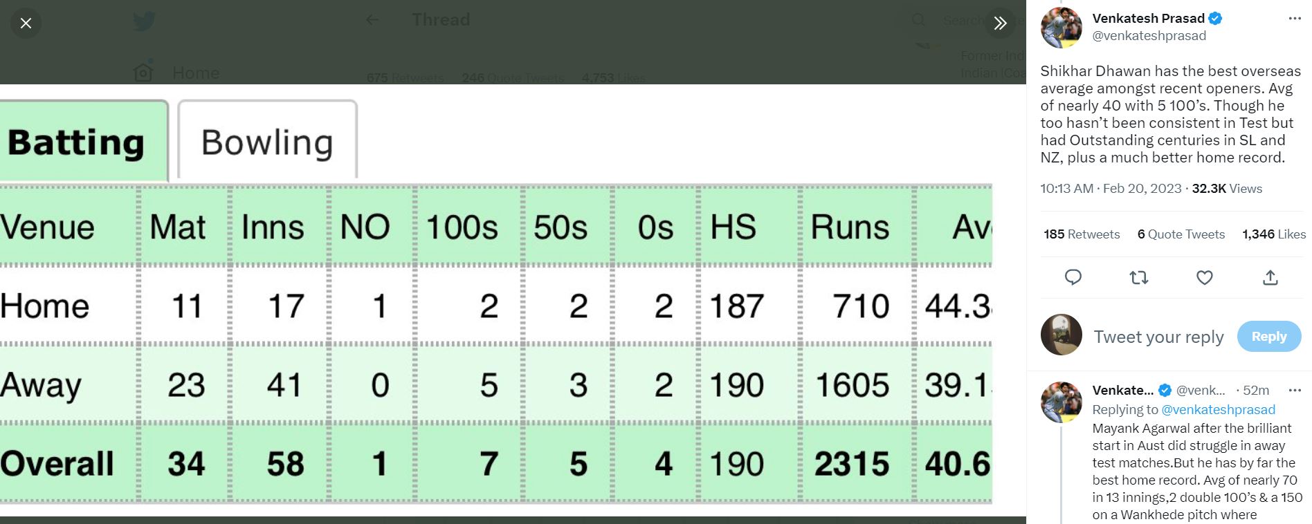 "Shikhar Dhawan has the best overseas average amongst recent openers. Avg of nearly 40 with 5 100's. Though he too hasn't been consistent in Test but had Outstanding centuries in SL and NZ, plus a much better home record," the former India seamer wrote in another tweet.
