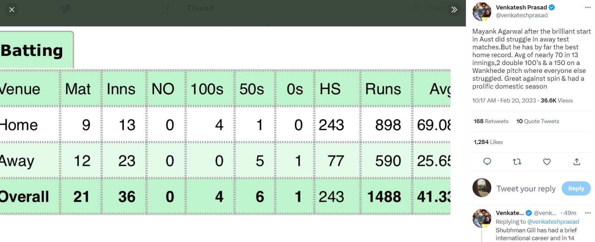 "Mayank Agarwal after the brilliant start in Aust did struggle in away test matches.But he has by far the best home record. Avg of nearly 70 in 13 innings,2 double 100's & a 150 on a Wankhede pitch where everyone else struggled. Great against spin & had a prolific domestic season," Prasad tweeted.