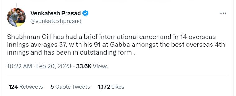 "Shubhman Gill has had a brief international career and in 14 overseas innings averages 37, with his 91 at Gabba amongst the best overseas 4th innings and has been in outstanding form," he tweeted.