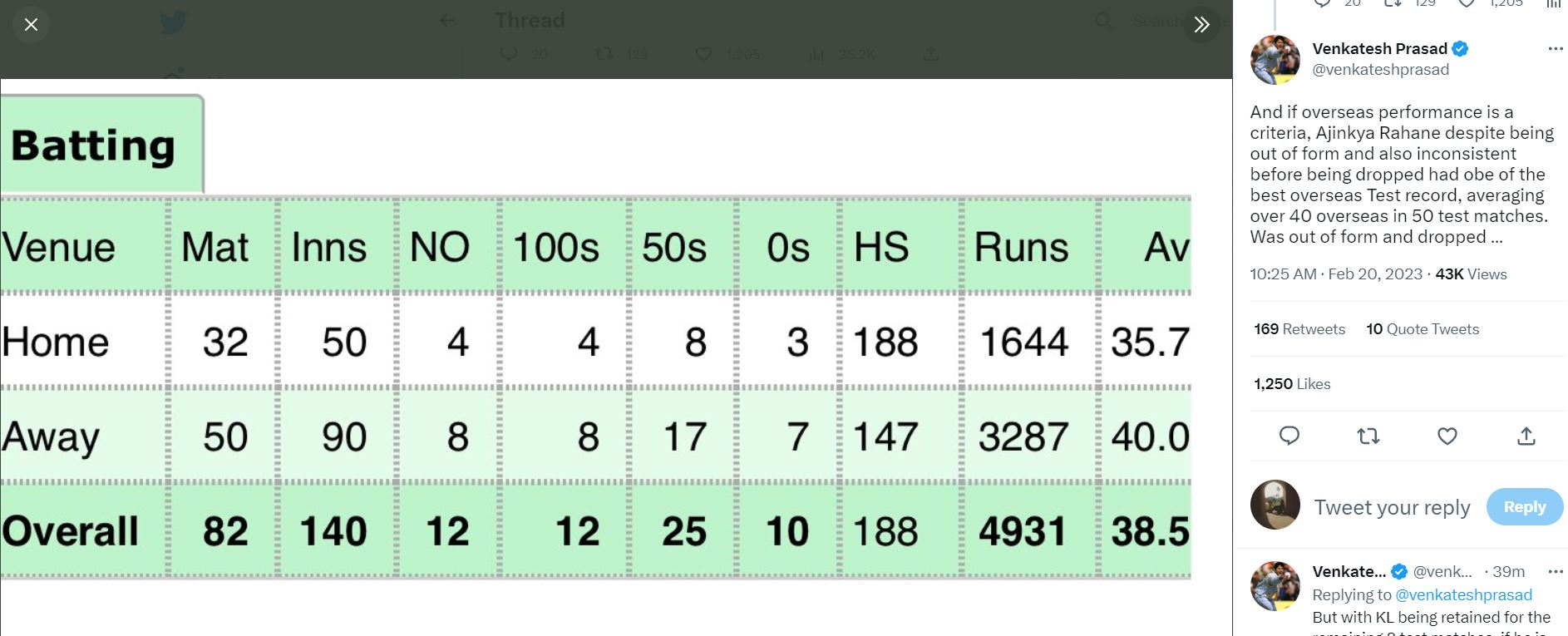 "And if overseas performance is a criteria, Ajinkya Rahane, despite being out of form and also inconsistent before being dropped had one of the best overseas Test record, averaging over 40 overseas in 50 test matches. Was out of form and dropped ...," the former India seamer added in another tweet.