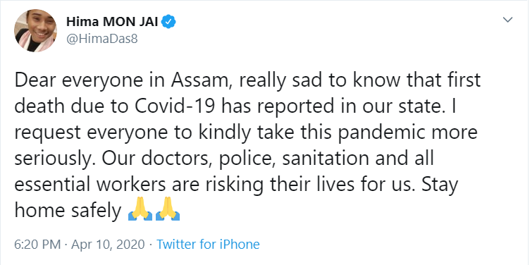 "Dear everyone in Assam, really sad to know that first death due to the Covid-19 has reported in our state. I request everyone to kindly take this pandemic more seriously. Our doctors, police, sanitation and all essential workers are risking their lives for us. Stay home safely," Das tweeted.