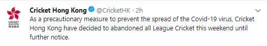 "As a precautionary measure to prevent the spread of the Covid-19 virus, Cricket Hong Kong have decided to abandoned all League Cricket this weekend until further notice," the Cricket Hong Kong tweeted.