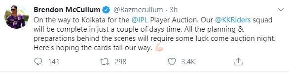"On the way to Kolkata for the @IPL Player Auction. Our @KKRiders squad will be completed in just a couple of days' time. All the planning & preparations behind the scenes will require some luck come auction night. Here's hoping the cards fall our way," McCullum tweeted.