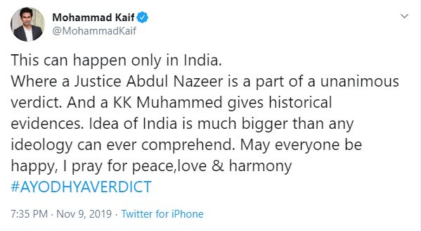 "This can happen only in India. Where a Justice Abdul Nazeer is a part of a unanimous verdict. And a KK Muhammed gives historical evidences. Idea of India is much bigger than any ideology can ever comprehend. May everyone be happy, I pray for peace,love & harmony #AYODHYAVERDICT," Kaif tweeted.