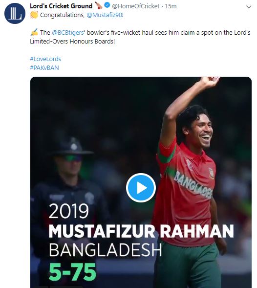 "Congratulations, @Mustafiz90! The @BCBtigers' bowler's five-wicket haul sees him claim a spot on the Lord's Limited-Overs Honours Boards!" Lord's Cricket Ground said in a tweet.
