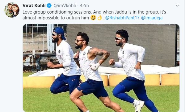 Taking to Twitter, Kohli shared a picture in which he along with Jadeja and Rishabh Pant are running during the practice. Jadeja can be seen as the front runner followed by Kohli and Pant.