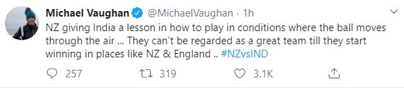 "NZ giving India a lesson in how to play in conditions where the ball moves through the air ... They can't be regarded as a great team till they start winning in places like NZ & England .. #NZvsIND," Vaughan tweeted.