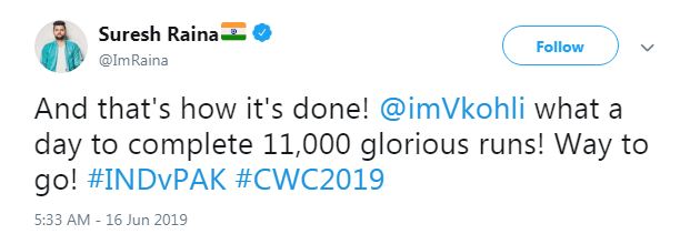 "Consistent. Brilliant. Mature. What a spectacular 100 by Rohit Sharma! It's extra special when it's #INDvPAK in the WC! #CWC2019" Suresh Raina tweeted.