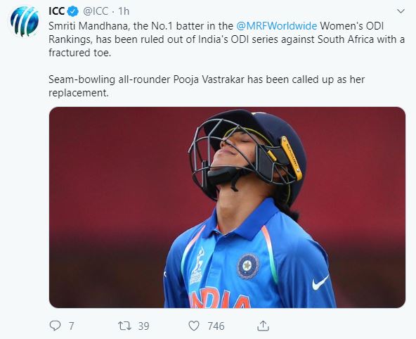 "Smriti Mandhana, the No.1 batter in the @MRFWorldwide Women's ODI Rankings, has been ruled out of India's ODI series against South Africa with a fractured toe. Seam-bowling all-rounder Pooja Vastrakar has been called up as her replacement," ICC tweeted.