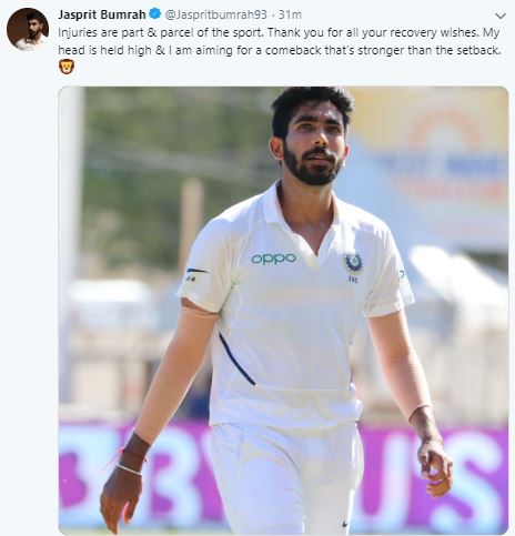 "Injuries are part and parcel of the sport. Thank you for all your recovery wishes. My head is held high and I am aiming for a comeback that's stronger than the setback," Bumrah tweeted.