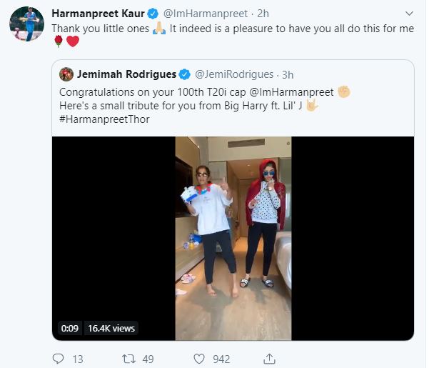 "Congratulations on your 100th T20i cap @ImHarmanpreet. Here's a small tribute for you from Big Harry ft. Lil' J. #HarmanpreetThor," Rodrigues tweeted.