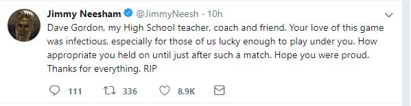 "Dave Gordon, my High School teacher, coach, and friend. Your love of this game was infectious, especially for those of us lucky enough to play under you. How appropriate you held on until just after such a match. Hope you were proud. Thanks for everything. RIP," Neesham tweeted.