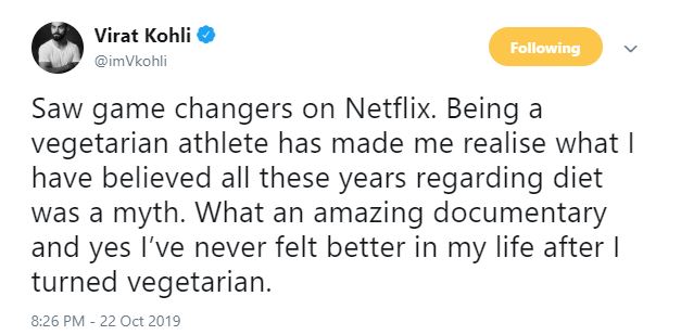 Taking to Twitter Kohli wrote, "Saw game changers on Netflix. Being a vegetarian athlete has made me realise what I have believed all these years regarding diet was a myth. What an amazing documentary and yes I've never felt better in my life after I turned vegetarian."