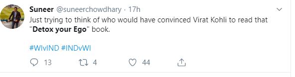 "Just trying to think of who would have convinced Virat Kohli to read that "Detox your Ego" book. #WIvIND #INDvWI," one fan tweeted.